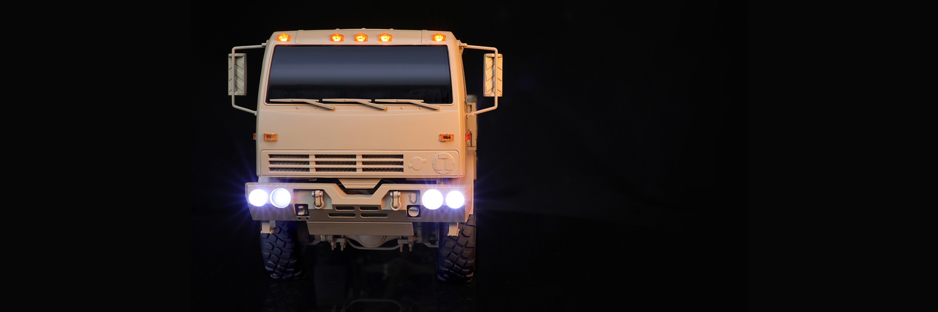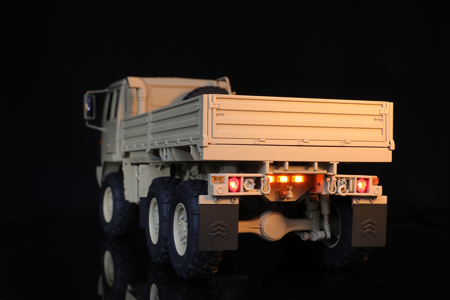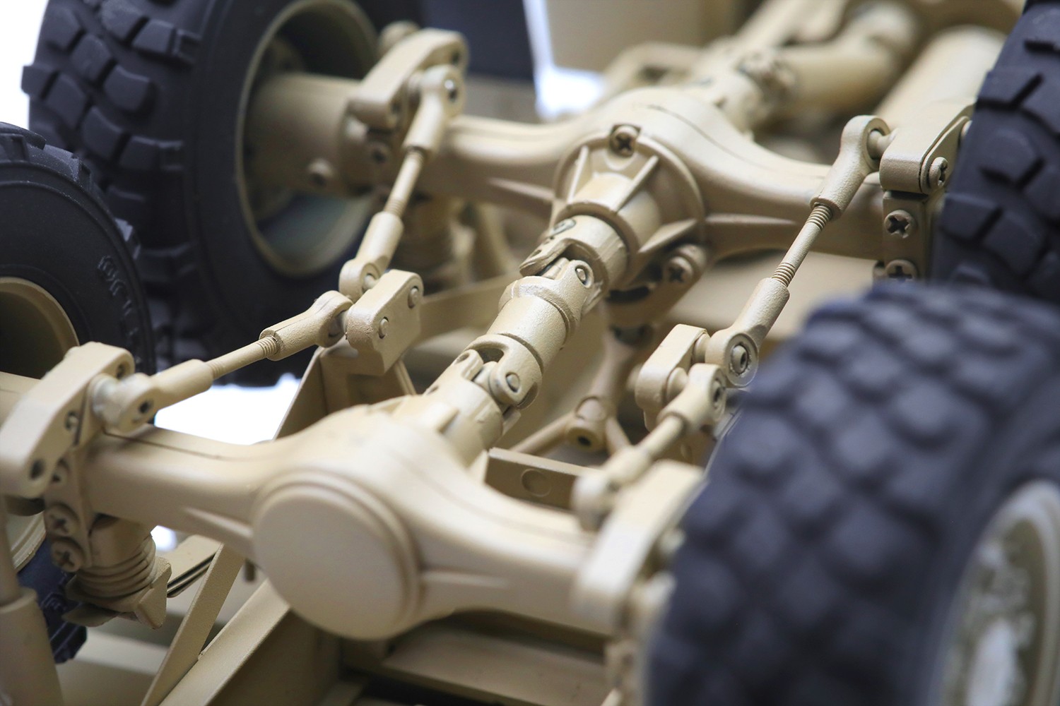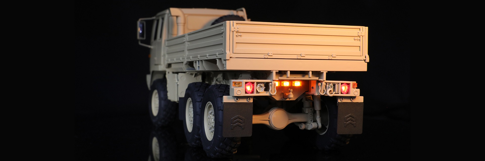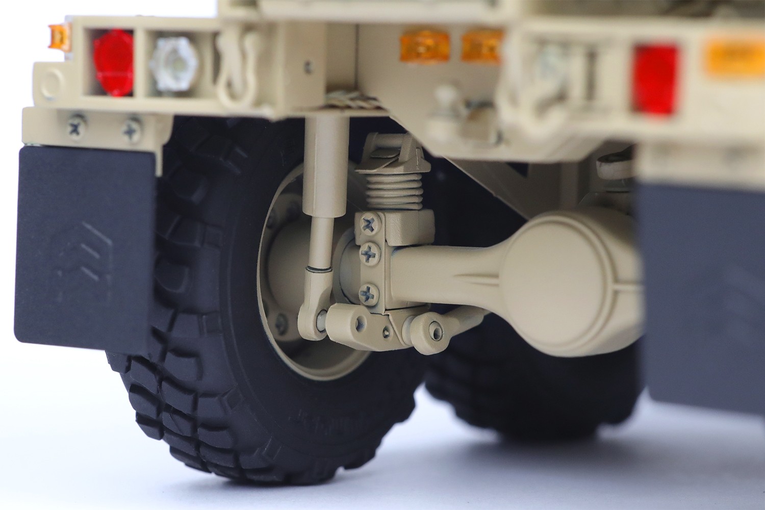 1/32军卡,采用20.7cm长铝制大梁,后桥为单点平衡式多层板簧悬挂结构&仿阻尼避震器,中置反转波箱,车头可翻转。