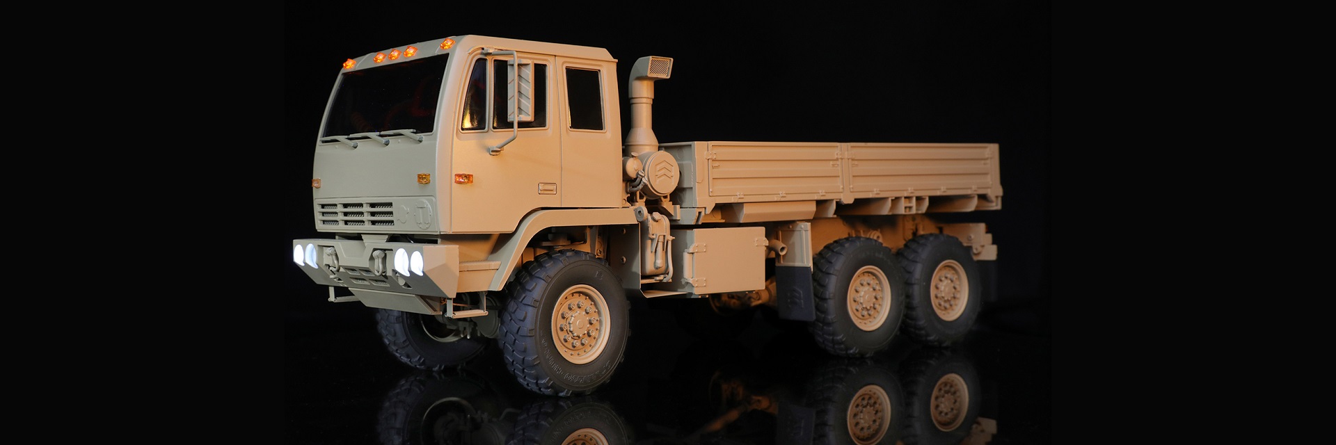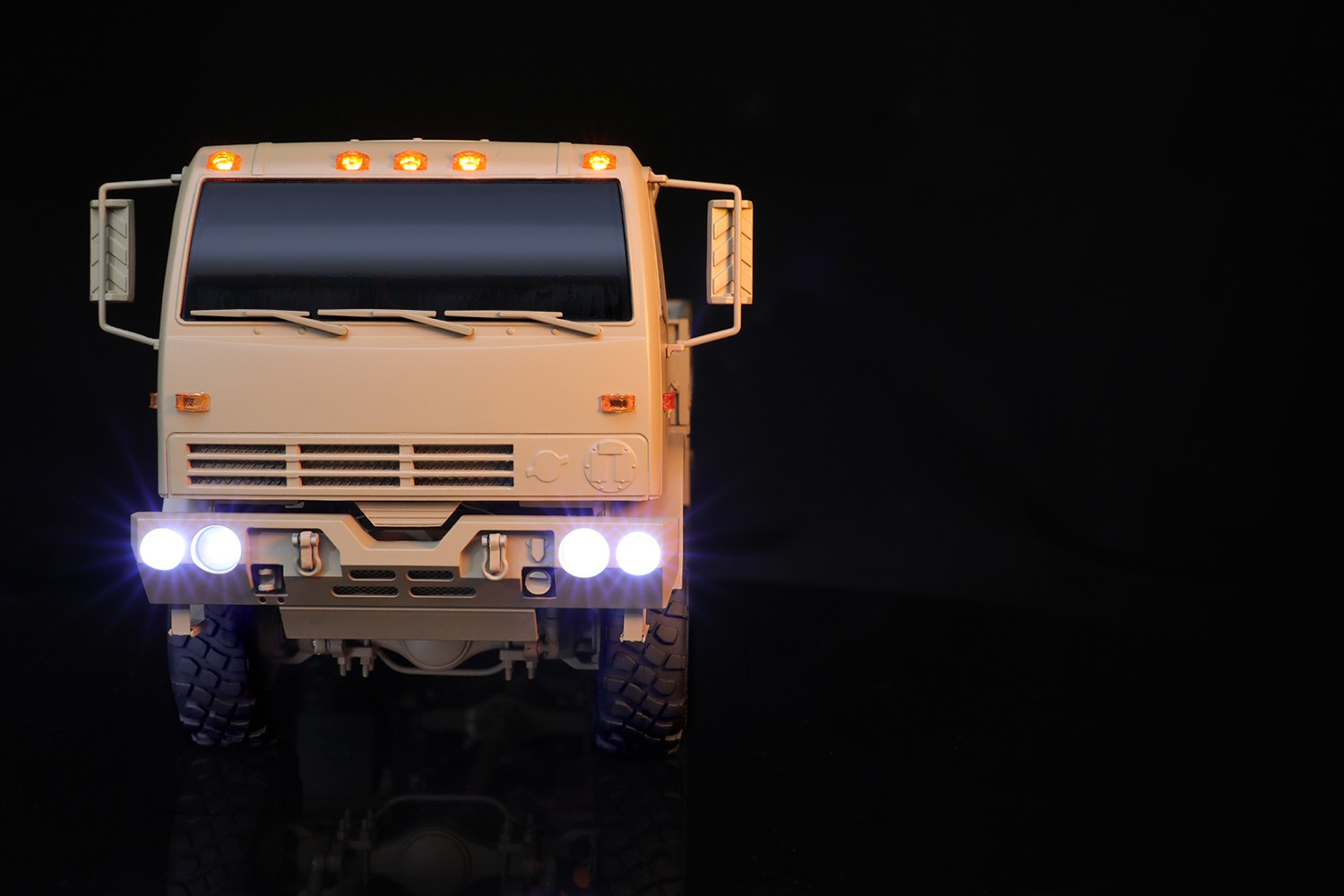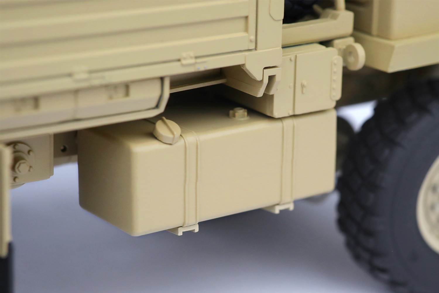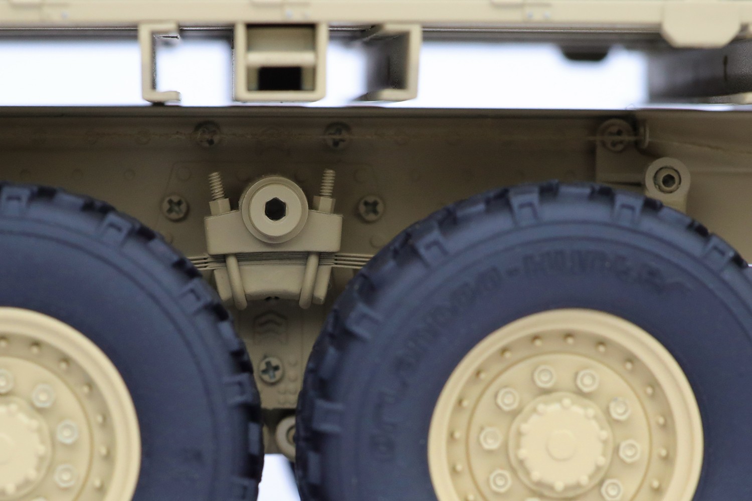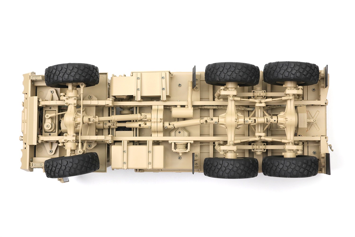 1/32军卡,采用20.7cm长铝制大梁,后桥为单点平衡式多层板簧悬挂结构&仿阻尼避震器,中置反转波箱,车头可翻转。