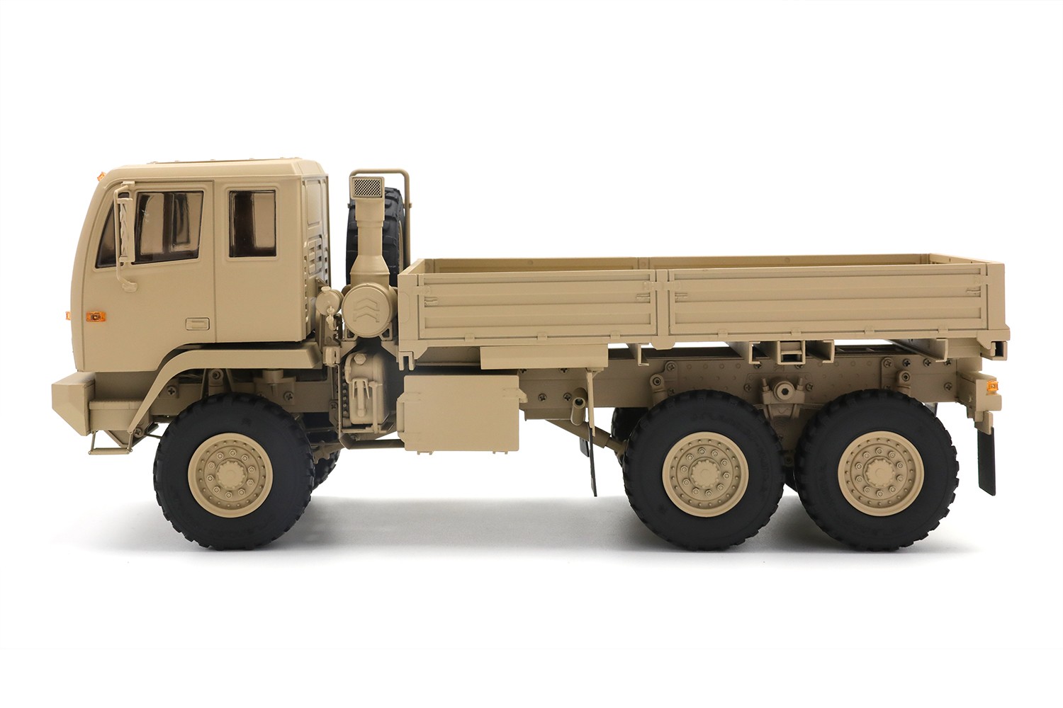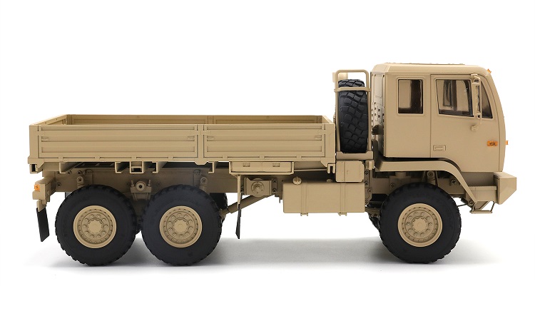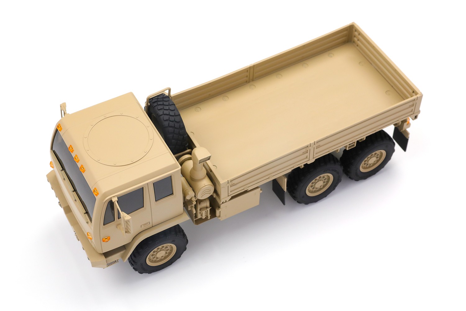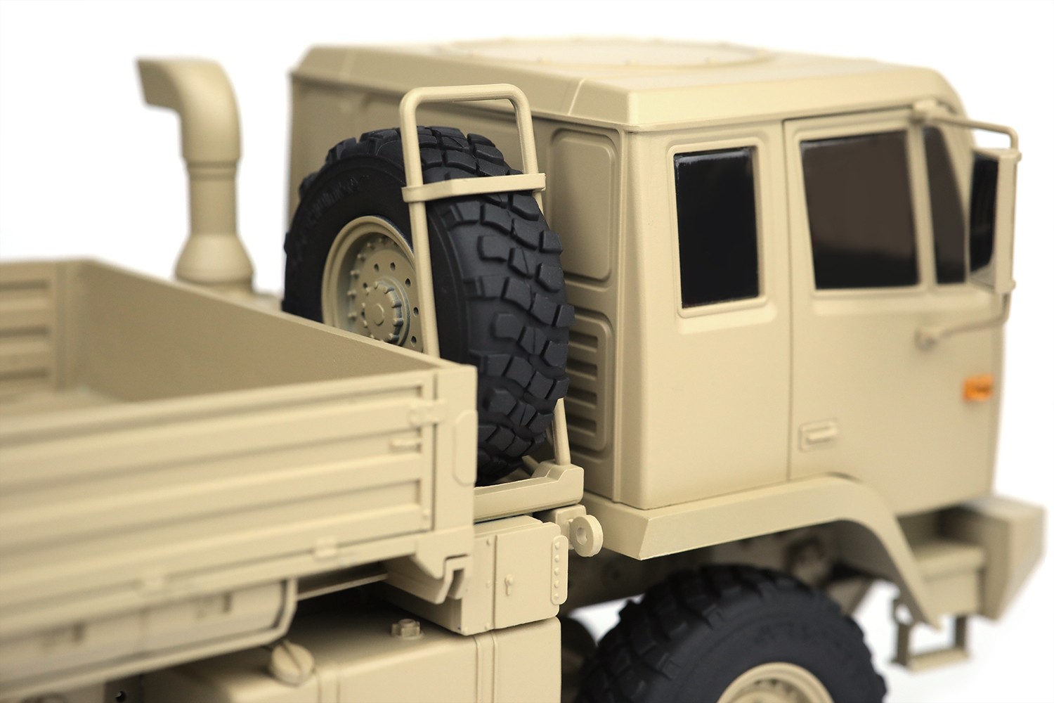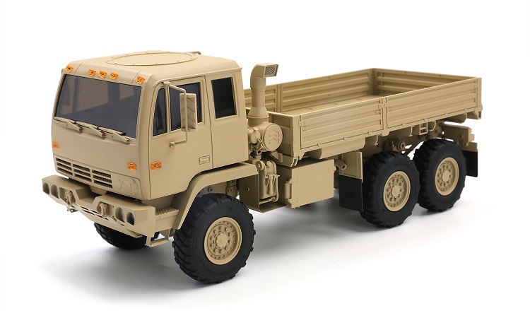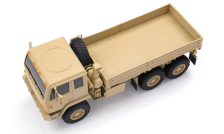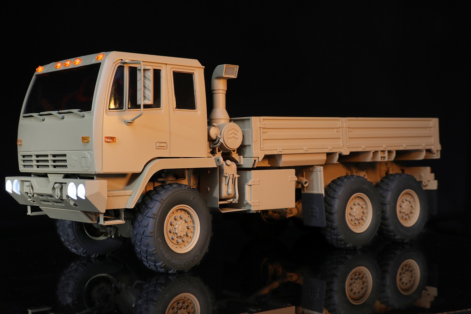 1/32军卡,采用20.7cm长铝制大梁,后桥为单点平衡式多层板簧悬挂结构&仿阻尼避震器,中置反转波箱,车头可翻转。